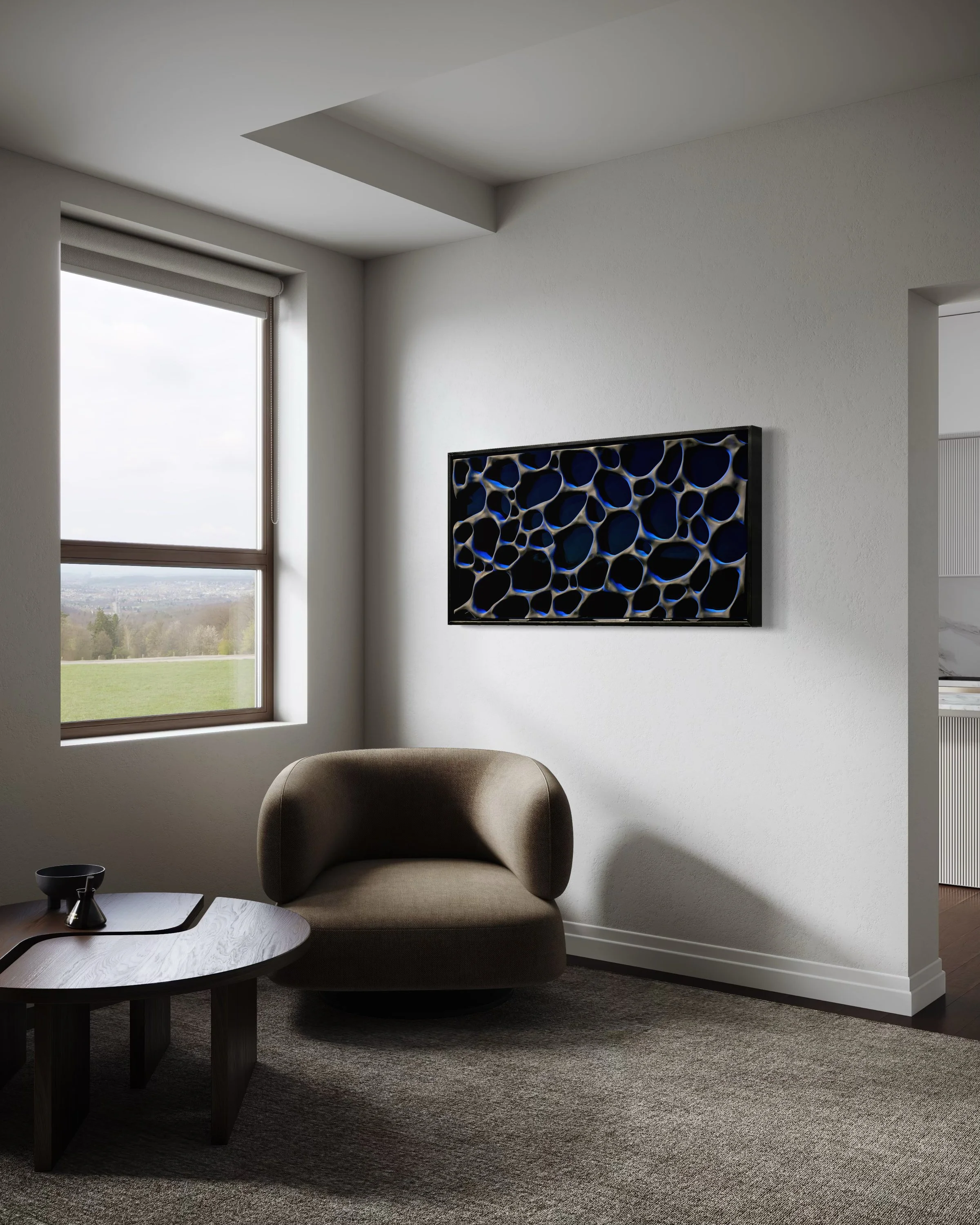 Ultra-matte black meets fluorescent blue — their interaction feels electric and alive under changing angles.